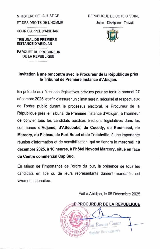 À l’approche des élections législatives prévues le 27 décembre 2025, le Procureur de la République près le Tribunal de Première Instance d’Abidjan invite les candidats des communes d’Adjamé, d’Attécoubé, de Cocody, de Koumassi, de Marcory, du Plateau, de Port-Bouët et de Treichville à une rencontre d’information et de sensibilisation.