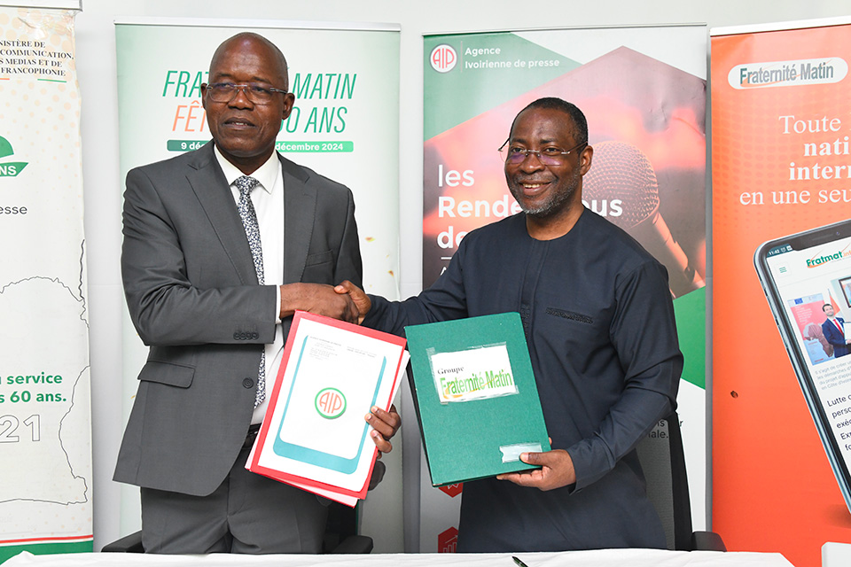 L’ Agence ivoirienne de presse (AIP) et le Groupe de presse Fraternité Matin ont procédé, vendredi 7 novembre 2025 au siège de l’Agence à Abidjan-Plateau, à la signature d’un partenariat visant à renforcer la coopération entre les deux institutions de média pour une synergie dans la production médiatique publique. Le directeur général de l’AIP, Fausséni Dembélé, a indiqué que cette signature s’inscrit dans la vision du ministère de la Communication, qui encourage la mise en synergie des structures publiques du secteur. « C’est une volonté forte affichée par le ministre de la Communication, Amadou Coulibaly, de voir des partenariats solides se développer entre les institutions du ministère, afin de mutualiser les moyens et d’atteindre nos objectifs avec plus d’efficacité », a-t-il déclaré. M. Dembélé a salué le travail des équipes techniques et juridiques des deux institutions et a souhaité un partenariat gagnant-gagnant permettant d’accomplir nos missions avec efficacité et de développer des ressources additionnelles pour faire progresser nos structures. Pour sa part, le directeur général du groupe Fraternité Matin, Serge Abdel Nouho, a exprimé sa satisfaction quant à la portée de cet accord. « Cet accord-cadre que nous signons ce jour consacre notre volonté commune de bâtir un écosystème collaboratif de production, de diffusion et d’innovation médiatique au service d’une information citoyenne crédible et moderne. Il traduit aussi notre engagement à relever ensemble les défis de la transformation numérique et de la compétitivité dans le secteur de l’information publique. En unissant nos expertise, avec l’AIP, Fraternité Matin s’engagent à créer des passerelles solides entre nos équipes », a expliqué M. Nouho. Il a précisé que cet accord entre les deux institutions s’engage à mettre en œuvre plusieurs projets structurants notamment, le développement d’une plateforme multimédia interactive, couplant AIP et Fraternité Matin, qui portera notre signature commune et proposera des contenus accessibles sur le web et sur le mobile. Il s’agira également de la production de contenus journalistiques à fort valeur ajoutée, Enquêtes, reportages, dossiers, thématiques et documentaires sur les 15 enjeux de la vie nationale. La mise en place d’une cellule conjointe de formation, d’expérimentation et de partage des bonnes pratiques professionnelles. La valorisation de la mission des services publics à travers les campagnes éditoriales et institutionnelles conjointes. Et le développement du journalisme de données, du fact-checking et des formats innovants, podcasts, vidéos, interactifs. Le directeur général a également annoncé un projet en cours de création d’un centre de documentation numérique au sein de Fraternité Matin. « Ce centre permettra l’accès à une base de données historique depuis 1964. Nous pensons que cette initiative peut également intéresser l’AIP, afin de réfléchir ensemble à une mutualisation de nos ressources documentaires, dans une perspective de création de valeur et de nouvelles sources de revenus », a-t-il expliqué. L’AIP a été créée par la loi n°61-200 du 2 juin 1961, est un Établissement public national à caractère administratif. Elle est placée sous la tutelle administrative et technique du ministère de la Communication, et sous la tutelle économique et financière du ministère de l’Économie et des Finances. Elle a pour mission principale la collecte, le traitement et la diffusion de l’information sur l’ensemble du territoire national, à travers un réseau de correspondants couvrant toutes les régions du pays. Fraternité Matin communément appelé « Frat Mat », est un quotidien ivoirien, édité par le groupe de presse public du même nom. Créé le 9 décembre 1964 par le Président Félix Houphouët-Boigny, le journal, s’est imposé au fil des décennies comme un média de référence dans le paysage de la presse nationale. Contrôlé par l’État, il est publié à environ 3000 exemplaires par jour et dispose également de plateformes numériques. AIP
