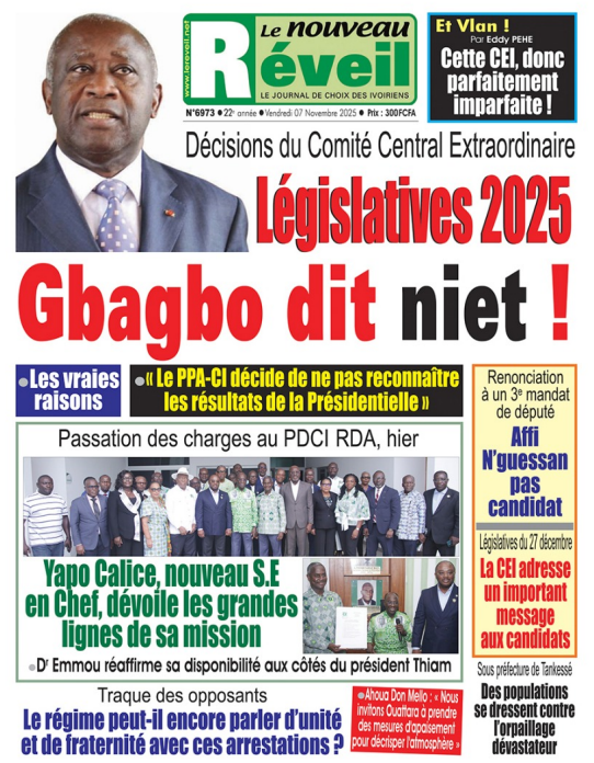 La scène politique ivoirienne est dominée par la position du Parti des peuples africains – Côte d’Ivoire (PPA-CI) sur les législatives du 27 décembre, et par la présentation des candidats du Rassemblement des Houphouëtistes pour la démocratie et la paix (RHDP), selon la revue des titres des journaux de ce vendredi 7 novembre 2025. Générations Nouvelles publie « Elections législatives, Laurent Gbagbo dit non. Selon le comité central du PPA-CI, les conditions d’élections crédibles ne sont pas réunies ». Le Quotidien d’Abidjan soutient « En comité central ordinaire hier jeudi, le PPA-CI dit non aux législatives du 27 décembres prochain. Gbagbo et son parti disent ne pas reconnaitre les résultats de l’élection présidentielle ». De même, Le Nouveau Réveil affirme « Décisions du Comité central extraordinaire, Législatives 2025, Gbagbo dit niet ! » et « Yapo Calice, nouveau S.E en chef, dévoile les grandes lignes de sa mission ». La Voie originale affiche également « Participation aux législatives du 27 décembre, le PPA-CI dit non dans les conditions délétères actuelles ». Abidjan 24 atteste « Le PPA-CI signe forfait ». L’@venir soutient « Le PPA-CI boycotte les législatives ». Notre Voie titre « Législatives de décembre, Affi N’Guessan passe la main ». Et Le Jour Plus soutient « Législatives 2025, Pascal Affi N’Guessan abandonne le combat ». « Du Front commun au Fronts fissuré : Le PDCI-RDA aux législatives sans le PPA-CI ? » s’interroge L’Intelligent d’Abidjan. Tribune Ivoire affirme « Législatives 2025, Gbagbo mélange tout au Front commun ». D’un autre bord, RHDP Infos affiche « Elections législatives 2025, voici la liste complète des candidats RHDP retenus. Ouattara mise sur des gros calibres pour un autre coup K.O ». Dans le même ordre, Le Patriote publie « Elections législatives du 27 décembre 2025, voici les candidats du RHDP ». Le Matin affiche « Elections législatives du 27 décembre, RHDP, la liste complète des candidats retenus ». Le Sursaut soutient « Législatives 2025, le choix des candidats. Comment les barons du RHDP ont verrouillé le processus ! Alassane Ouattara et le RHDP à l’épreuve du renouvellement. Les jeunes, quittez et revenez en 2023 ! ». L’Essor Ivoirien écrit, « RHDP, Après sa présidentielle, l’heure du renouveau ! ». Enfin, L’Expression donne à l’affiche « Législatives 2025, une semaine après l’ouverture du dépôt des dossiers, les candidats se font toujours attendre à la Commission électorale indépendante (CEI) ».