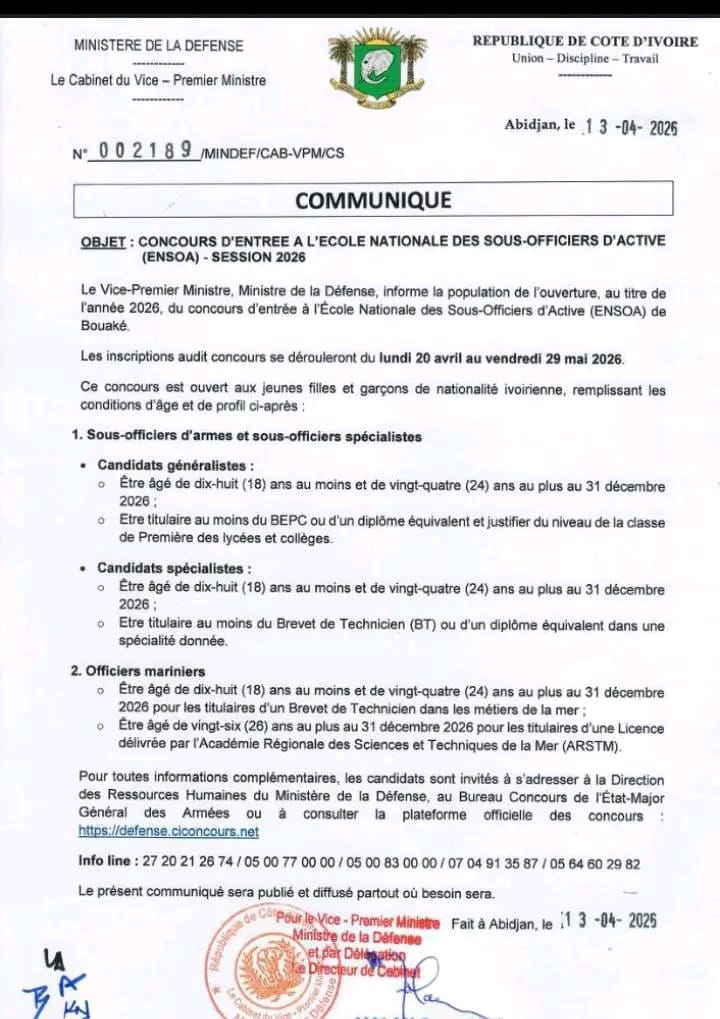 Dans un communiqué officiel en date du 13 avril 2026, le ministre de la Défense informait les populations du lancement du concours d’accès à l’ENSOA, établissement chargé de la formation des sous-officiers des forces armées ivoiriennes.