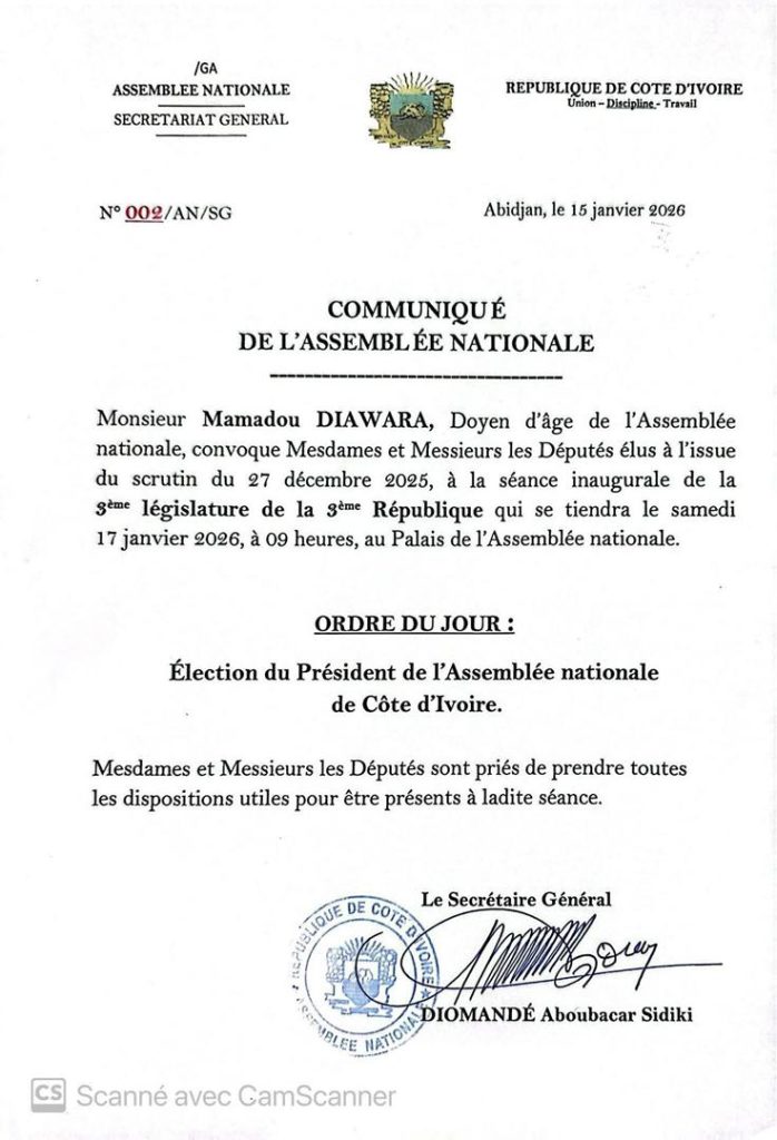 Le Secrétaire Général, Diomandé Aboubacar Sidiki, appelle l’ensemble des députés à prendre toutes les dispositions pour être présents à cette séance solennelle. Ce rendez‑vous institutionnel revêt une importance particulière, car il déterminera le leadership parlementaire pour les cinq prochaines années.