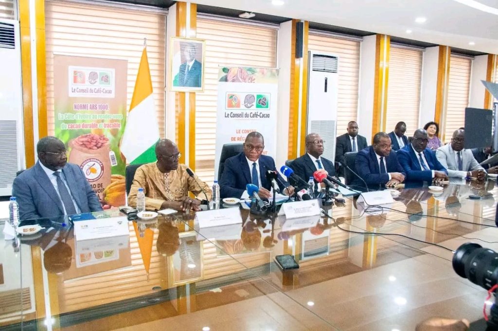 Le ministre a également rappelé les principes du mécanisme de stabilisation mis en place par la Côte d’Ivoire dans le cadre de la réforme de la filière cacao engagée en 2011. Ce dispositif garantit aux producteurs au moins 60 % du prix CAF (coût, assurance et fret) du cacao.