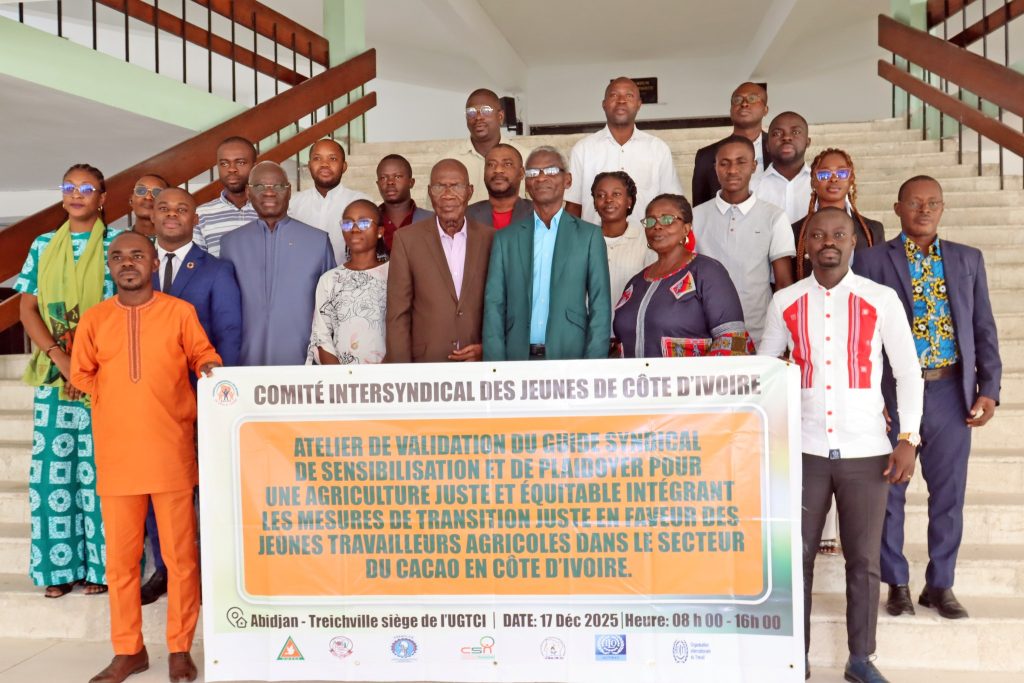 La Bourse du Travail de Treichville a abrité, le mercredi 17 décembre 2025, l’atelier national de validation du Guide syndical de sensibilisation et de plaidoyer à l’endroit des jeunes cacaoculteurs sur la transition juste. Organisée par le Comité intersyndical jeune de Côte d’Ivoire (CIJ-CI), en partenariat avec le Bureau international du Travail (BIT), la rencontre a réuni une trentaine d’acteurs syndicaux, institutionnels et techniques du secteur agricole.
