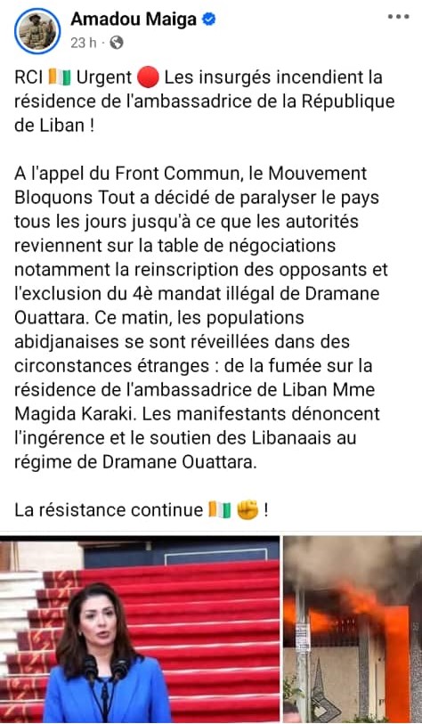 En quelques heures, la publication émanant d’un compte localisé dans un pays voisin a cumulé 990 mentions J’aime, 305 commentaires et 96 partages et prétend montrer l’incendie de la résidence de l’ambassadeur du Liban en Côte d’Ivoire.