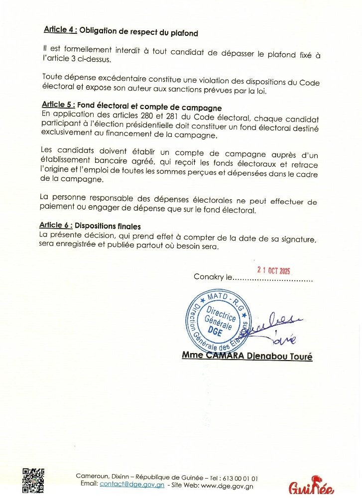 Le communiqué fixe également le plafond des dépenses de campagne à 40 milliards de GNF (2,6 milliards de FCFA) par candidat et avertit que tout dépassement constitue une infraction au Code électoral.