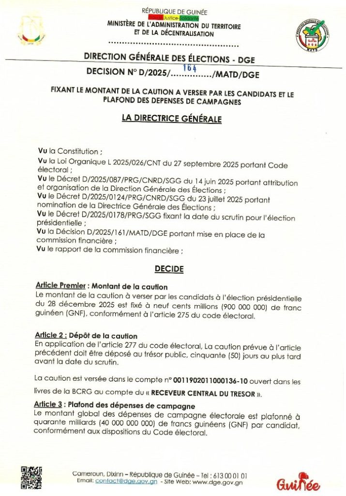 Dans un communiqué signé le 21 octobre 2025, Djénabou Camara Touré, directrice générale des élections (DGE), précise que ce montant est conforme à l’article 275 du Code électoral. Les candidats doivent déposer leur caution au Trésor public au plus tard 50 jours avant le scrutin, selon l’article 277 du Code électoral.