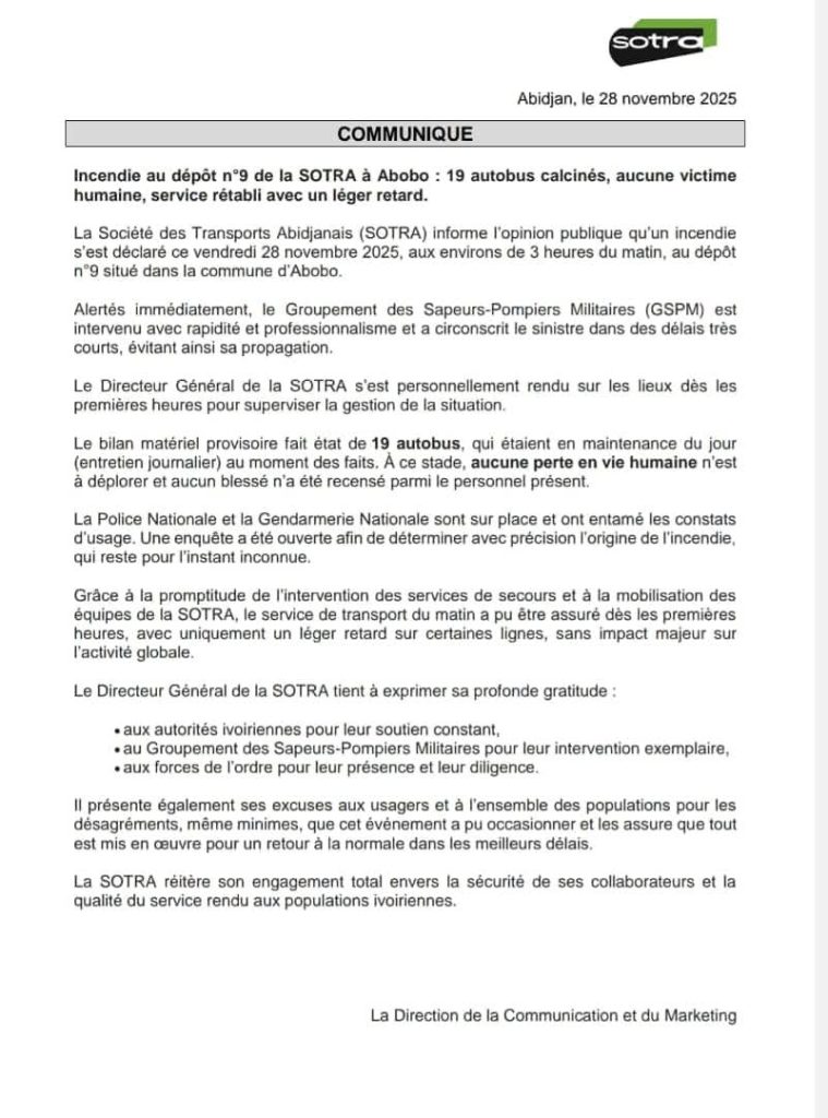 Malgré l’ampleur des dégâts matériels, la SOTRA assure avoir pu rétablir le service matinal, avec seulement « un léger retard sur certaines lignes » et sans perturbation majeure pour les usagers. La direction exprime sa gratitude aux autorités ivoiriennes pour leur soutien, au GSPM pour son intervention efficace et aux forces de l’ordre pour leur diligence.