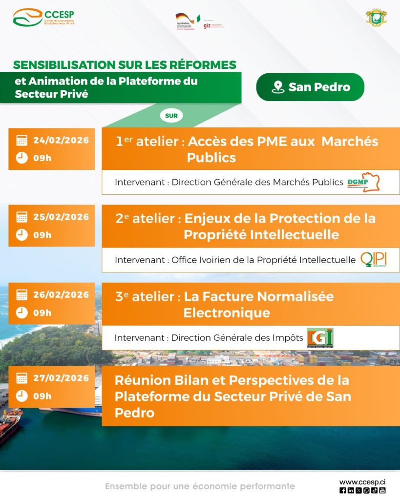 Dans le but de renforcer le dialogue public-privé et de contribuer durablement à l’amélioration du climat des affaires, la Plateforme Locale du Secteur Privé, effectue du 23 au 27 février 2026, une mission d’échange et d’animation dans la Région de San Pedro avec les opérateurs économiques.