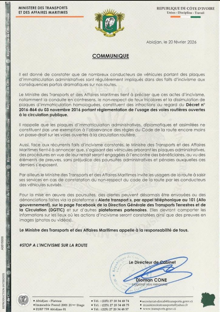 Le Ministère des Transports et des Affaires Maritimes de Côte d’Ivoire a publié, le 20 février 2026, un communiqué dénonçant les comportements d’incivisme routier commis par des conducteurs de véhicules arborant des plaques administratives. Ces derniers sont régulièrement impliqués dans des infractions graves telles que la conduite en sens interdit, le non-respect des feux tricolores ou encore la dissimulation de plaques homologuées.