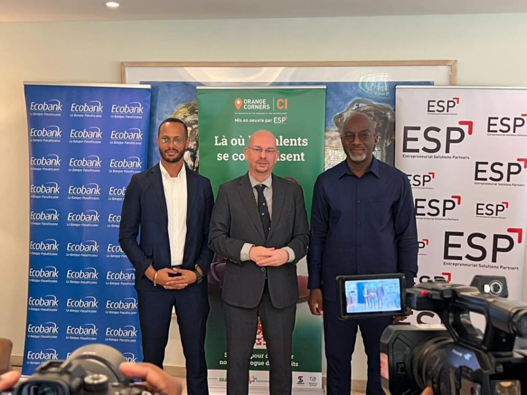 Entrepreneurial Solutions Partners (ESP) à travers son programme Orange Corners Côte d’Ivoire a décidé de s’associer à Ecobank Côte d’Ivoire, dans cadre du renforcement de son écosystème avec l’arrivée de son nouveau partenaire financier. Le mercredi 18 février 2026, ils ont paraphé ce partenariat stratégique en présence de Jeroen Kelderhuis, Ambassadeur du Royaume des Pays Bas en Côte d’Ivoire. A cette occasion, Paul-Harry Aithnard, Directeur Général de la banque et Directeur Régional exécutif pour la zone UEMOA et Teddy Roux, chargé de la mise en œuvre du programme en Côte d’Ivoire et Directeur Afrique de l’Ouest de ESP, se sont dit heureux de ce nouvel accord.