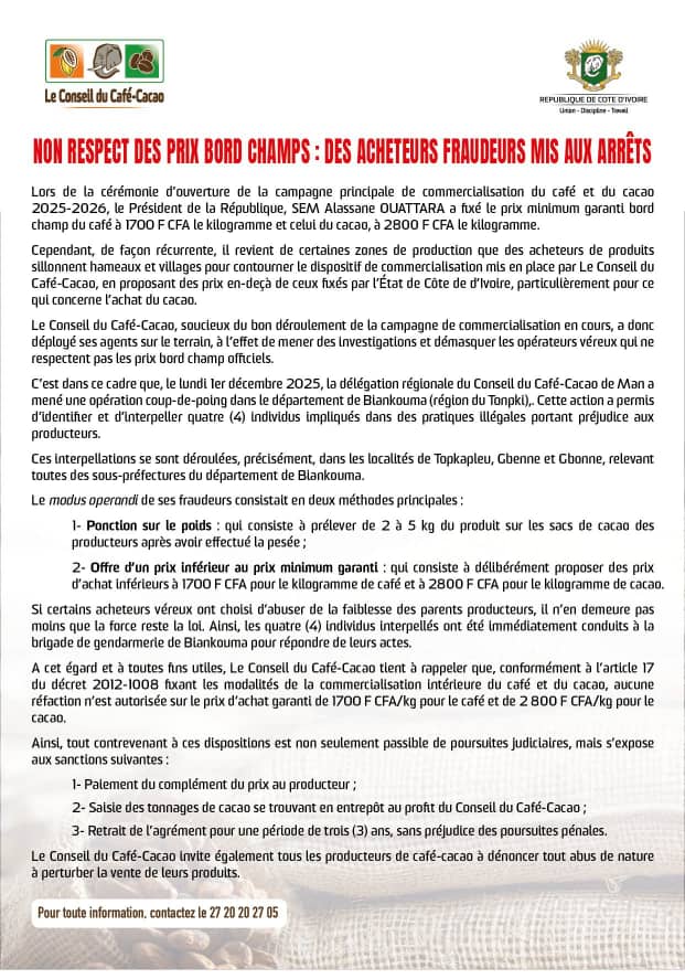 L’intervention menée à Topkapleu, Gbenne et Gbonne a permis de confirmer deux procédés frauduleux : la « ponction sur le poids » de 2 à 5 kg et l’offre de « prix inférieurs au prix minimum garanti ». Les quatre mis en cause ont été conduits à la brigade de gendarmerie de Biankouma.