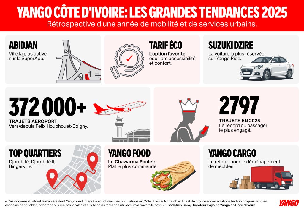 En rétrospective de l’année 2025, l’entreprise technologique mondiale et leader du vtc en Côte d’Ivoire, partage les principales tendances observées entre décembre 2024 et décembre 2025. Des trajets du quotidien aux déplacements vers l’aéroport, en passant par les voyages professionnels et les sorties nocturnes, les données confirment l’adoption croissante des services technologiques dans le pays, avec Yango jouant un rôle central dans l’évolution des usages urbains.