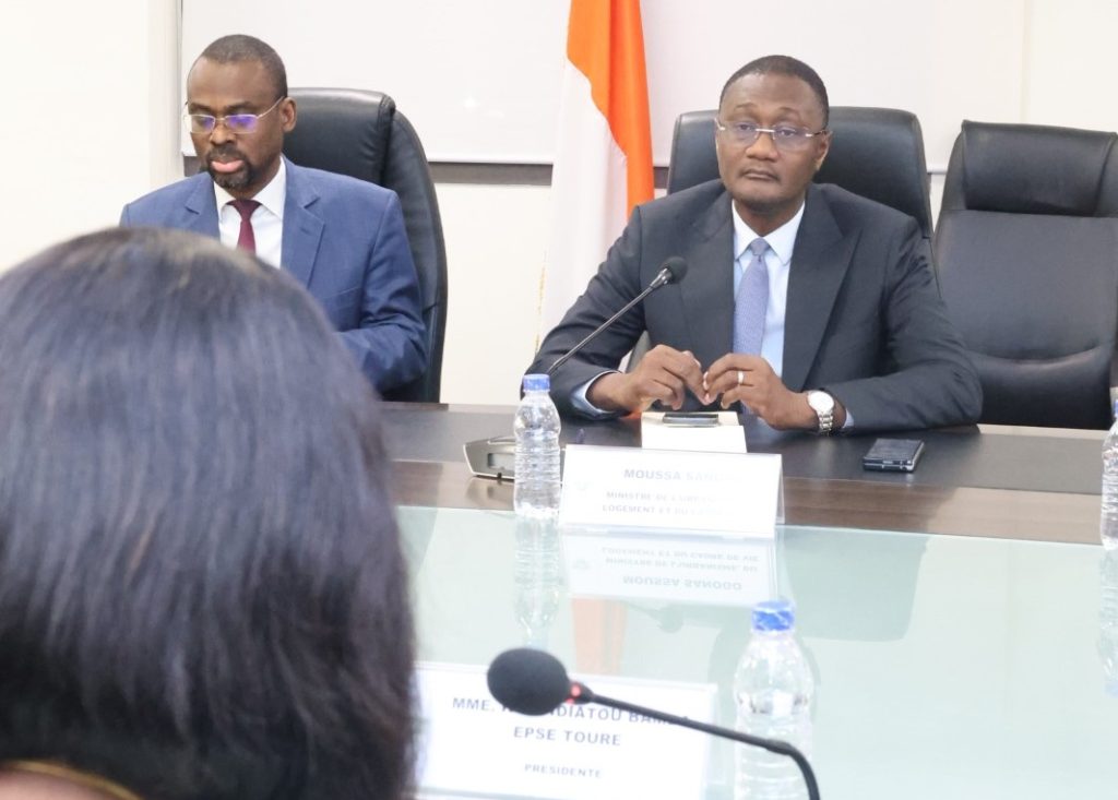 Khadidiatou Bamba épouse Touré, présidente de la Chambre nationale des experts immobiliers de Côte d’Ivoire et sa délégation ont échangé le mercredi 15 avril 2026, avec Moussa Sanogo, ministre de l’Urbanisme, du Logement et du Cadre de vie. Objectif de cette rencontre, présenter au ministre les missions et la vision de cette organisation professionnelle et trouver des solutions sur les problématiques liées à l’aménagement du territoire et à la gestion du foncier.