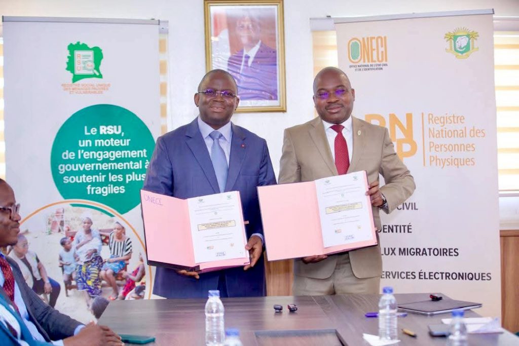 L’Office National de l’État Civil et de l’Identification (ONECI) et le Bureau de Coordination des Programmes des Filets Sociaux (BCPFS) ont franchi une étape importante dans la consolidation de la protection sociale en Côte d’Ivoire. Les deux institutions ont signé, le jeudi 02 avril à Abidjan, une convention stratégique visant à renforcer l’identification des bénéficiaires des filets sociaux.